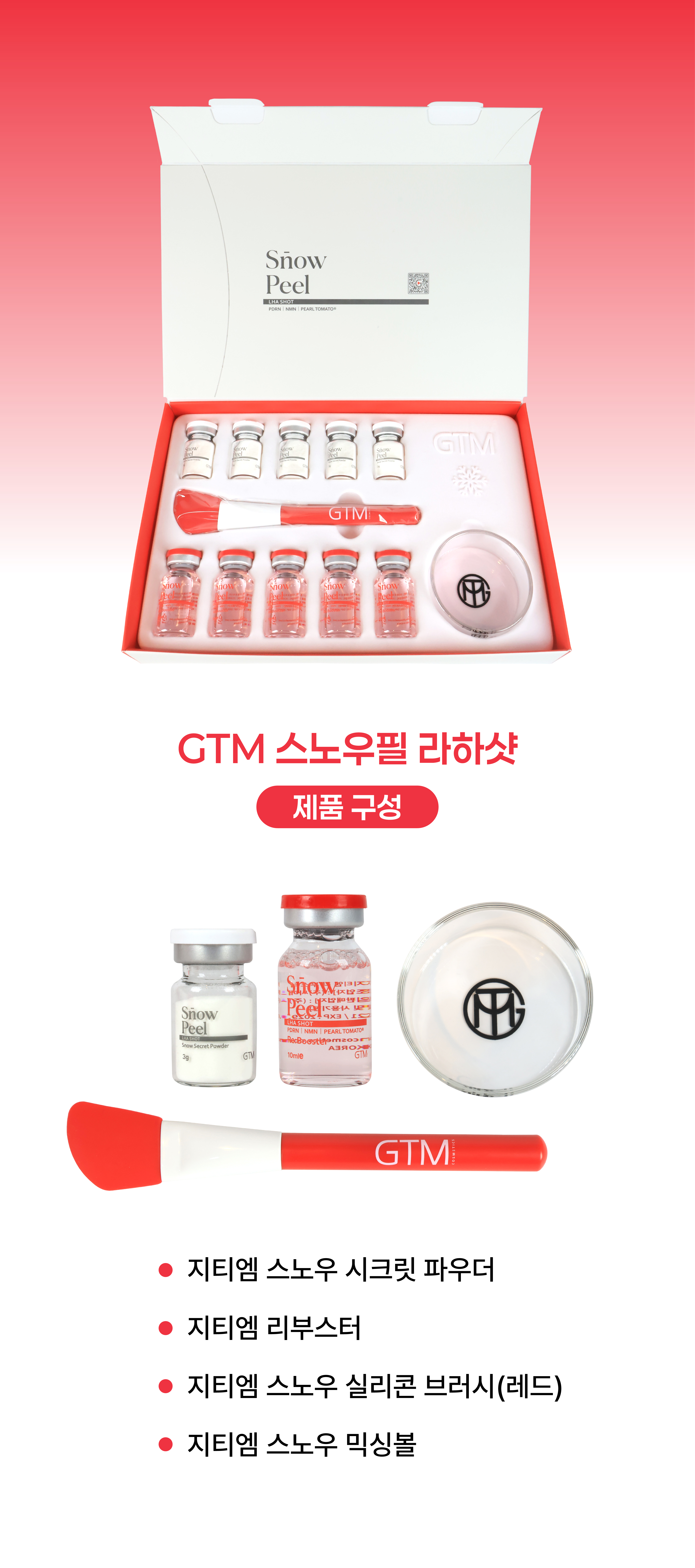 지티엠 스노우 시크릿 파우더 3g x 5ea, 지티엠 리부스터 10mle x 5ea, 지티엠 스노우 믹싱 볼, 지티엠 스노우 레드 실리콘 브러시